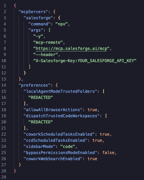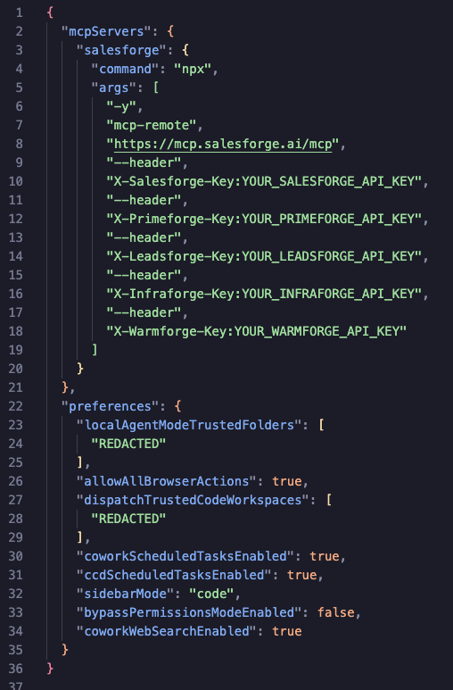 If you manage multiple Salesforge accounts (for example, separate accounts for different clients), you can run multiple instances of the MCP server side by side. Each instance connects to one account with its own set of API keys.