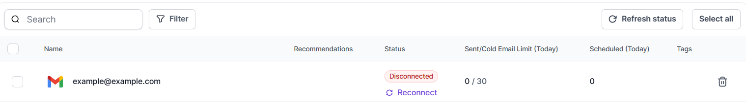 If you see any mailboxes in the “Disconnected” status that means one of your mailboxes is no longer connected to Salesforge and can not send any emails within your sequences.